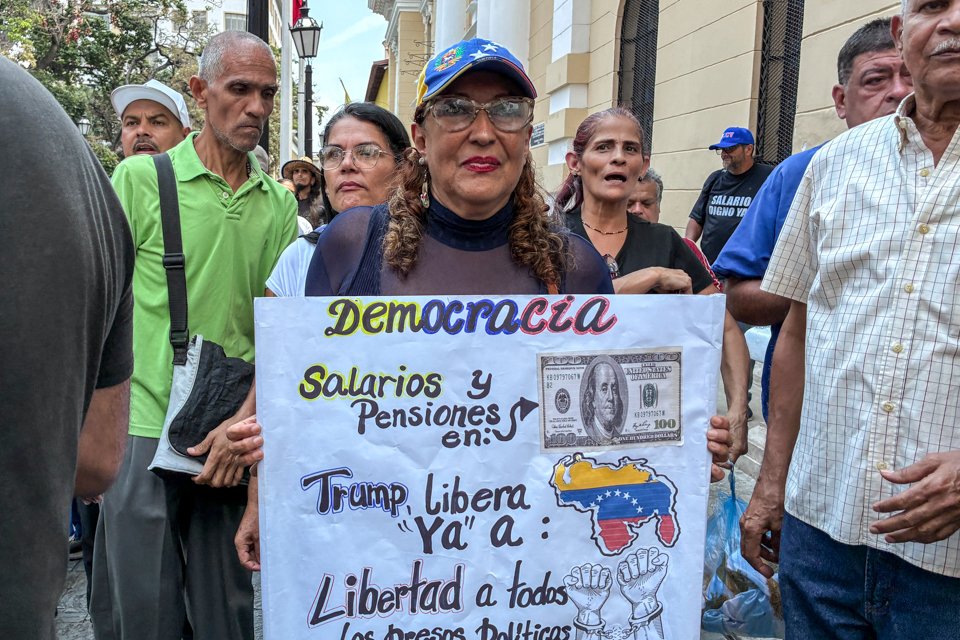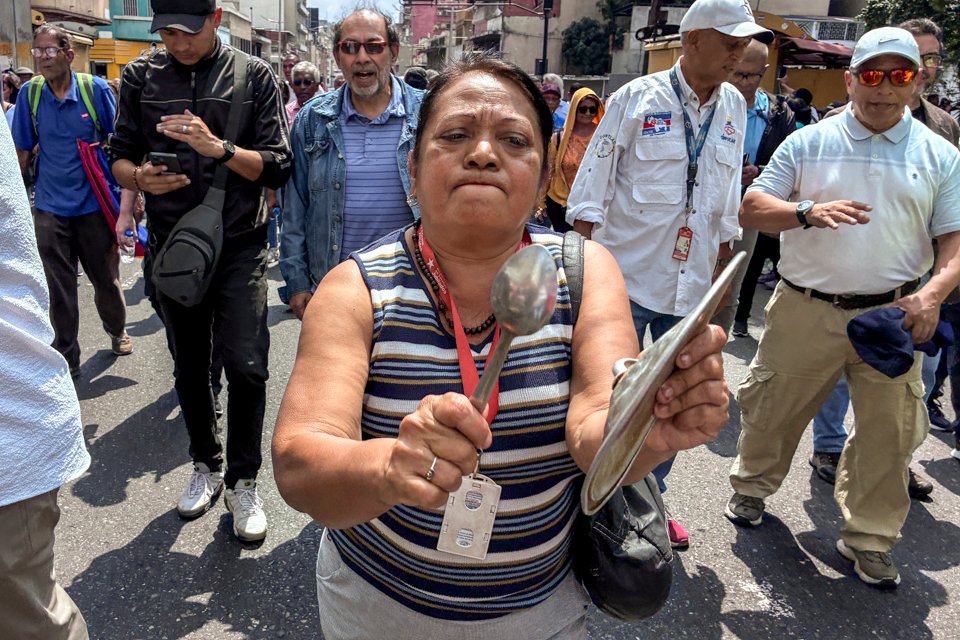 Las jubiladas también alzaron su voz. Mariela Díaz, jubilada de la Alcaldía de Caracas, describió la situación que enfrentan muchos hogares: “Tenemos las ollas vacías en la casa. ¿Qué pasa con esos Bs 130? Queremos un salario digno ya”, dijo durante la movilización.